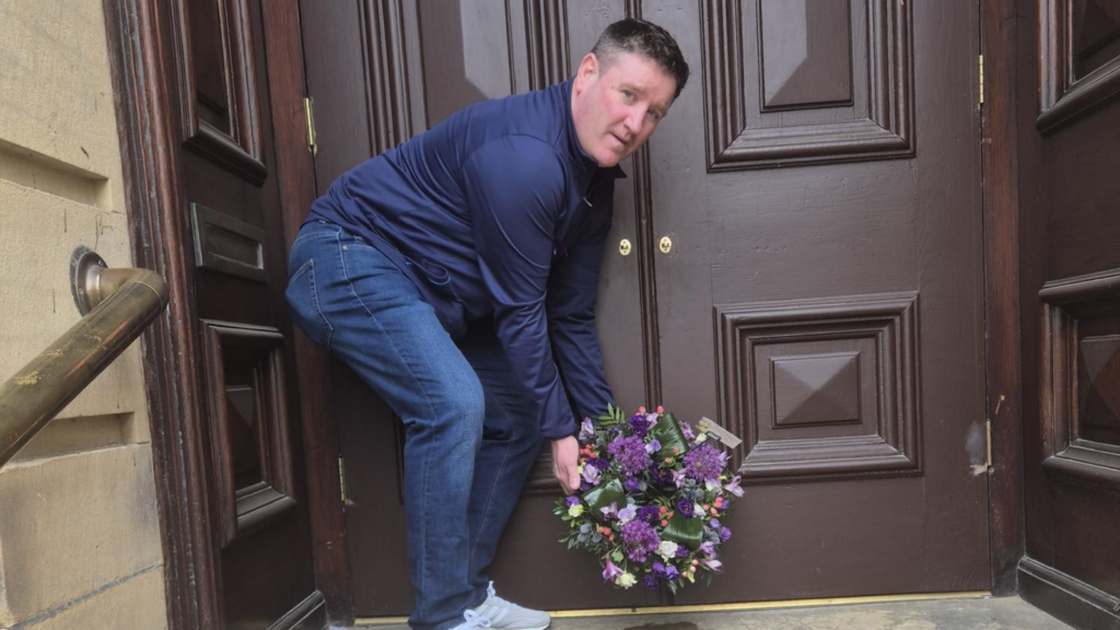 UNISON Kirklees branch secretary Mick Donoghue laying a wreath.